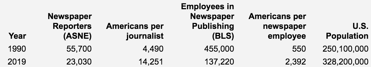 The first statistics use the “census” of daily newspaper journalists pulled together by the American Society of Newspaper Editors (ASNE). In 1990 we had one daily news(paper) journalist for every 4,490 Americans. Now (or 2019 to be exact), we have one such reporter per 14,250. The coverage density is more than three times worse. If you do the same calculations using the BLS numbers, which include all employment in newspaper publishing (including printing plant workers, etc), the drop is comparably steep.