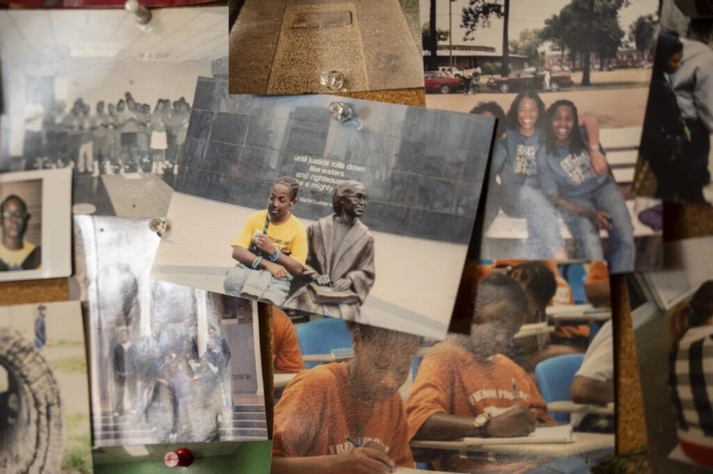 A photo of Tamorris Carter sitting next to a statue of Rosa Parks while on a field trip to Dallas hangs on the bulletin board at the Sunflower County Freedom Project. Andrea Morales/ MLK50