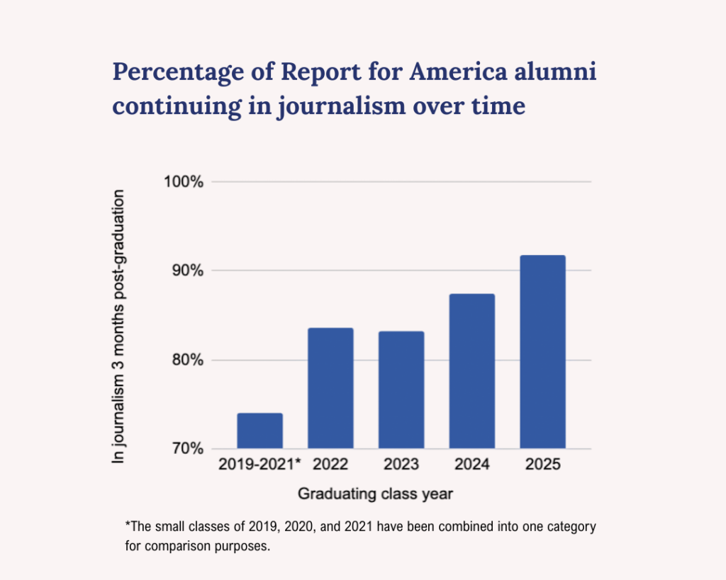 When I finished up this year’s research and looked at the stats, something stood out to me: Our corps members have increasingly decided to continue in journalism after graduating from Report for America. Among those who graduated in 2025, 92% continued in journalism jobs. That’s the highest percentage we’ve seen among our grads. (In 2024, 87% continued in journalism right after graduating and in 2023, the figure was 83%).